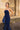 • El modelo Calatea es un vestido de alta costura en crepé azul profundo, que resalta la silueta femenina con elegancia.