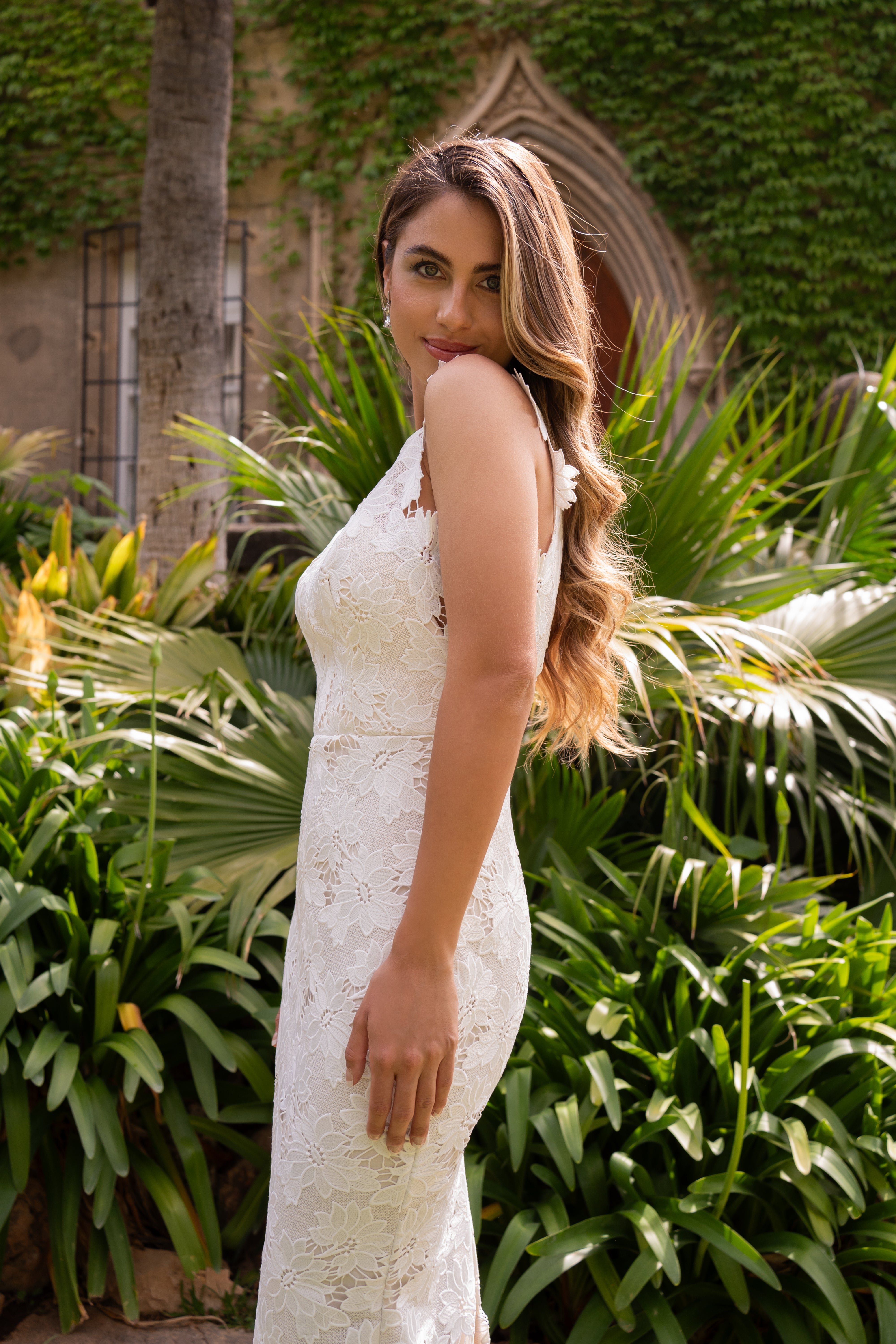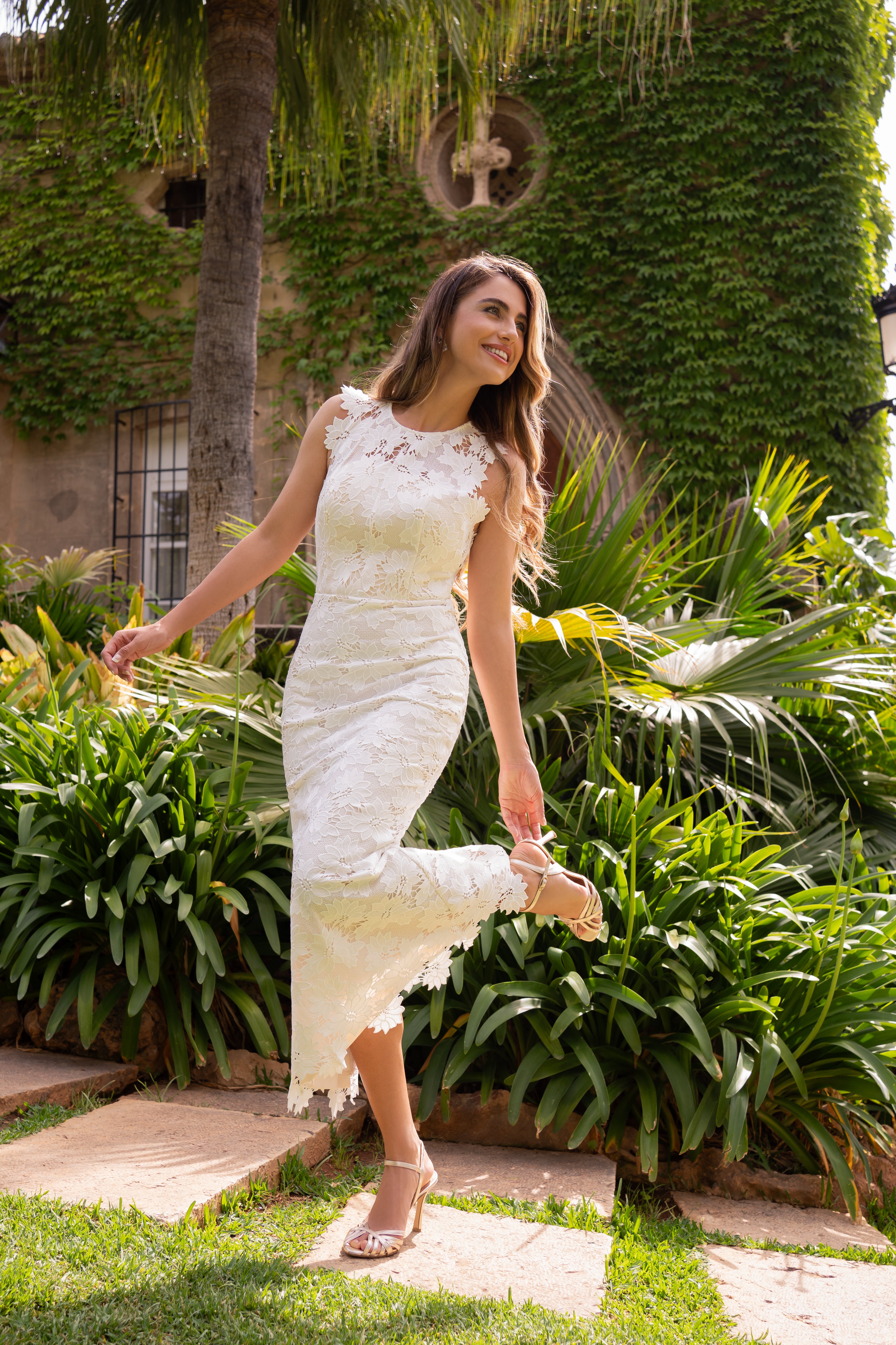 • Elaborado en guipur blanco roto, su sugerente pero discreto escote eleva el diseño y lo define.