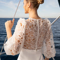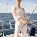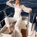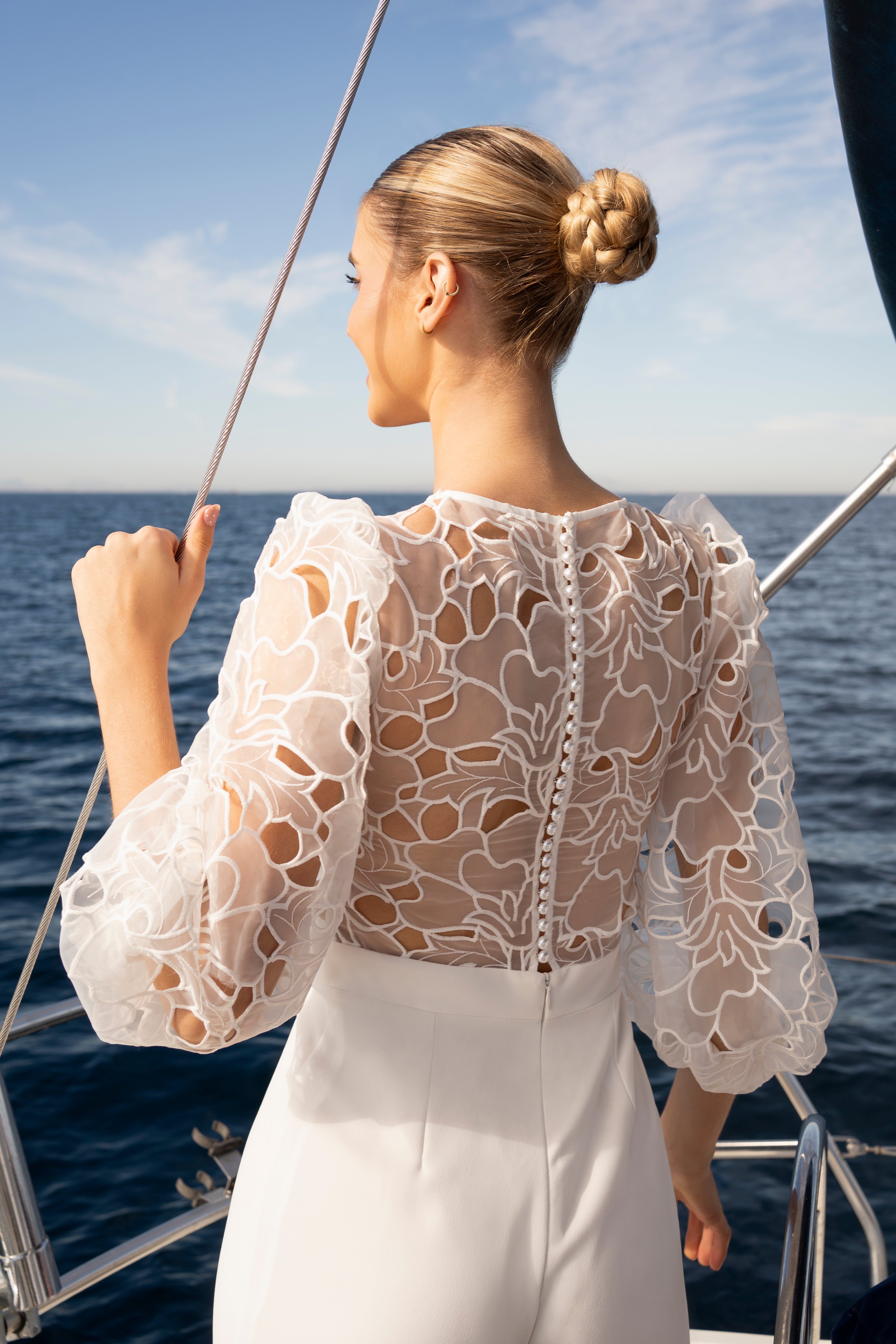 Un diseño de mono de una pieza para una novia romántica que busca elegancia con un toque etéreo.
