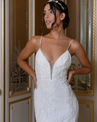 Splendido abito in tulle semitrasparente, accuratamente ricamato con strass bianchi.